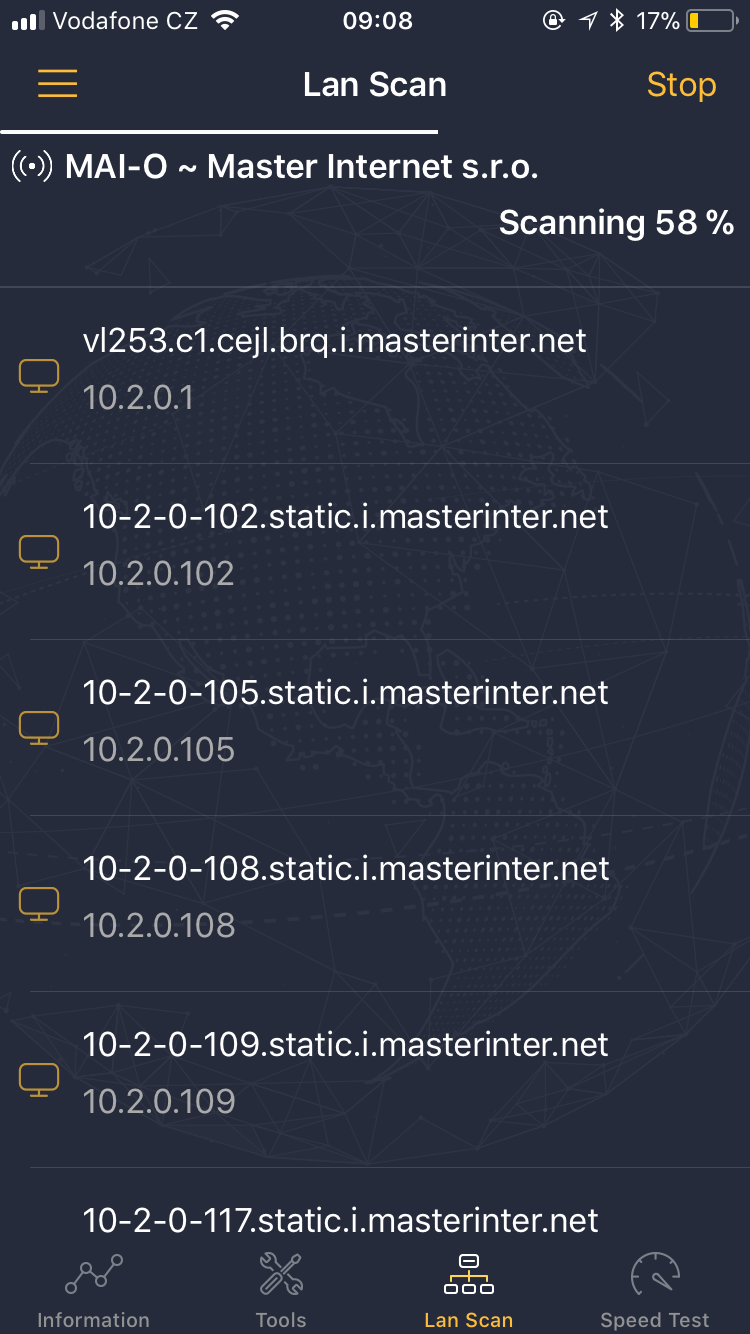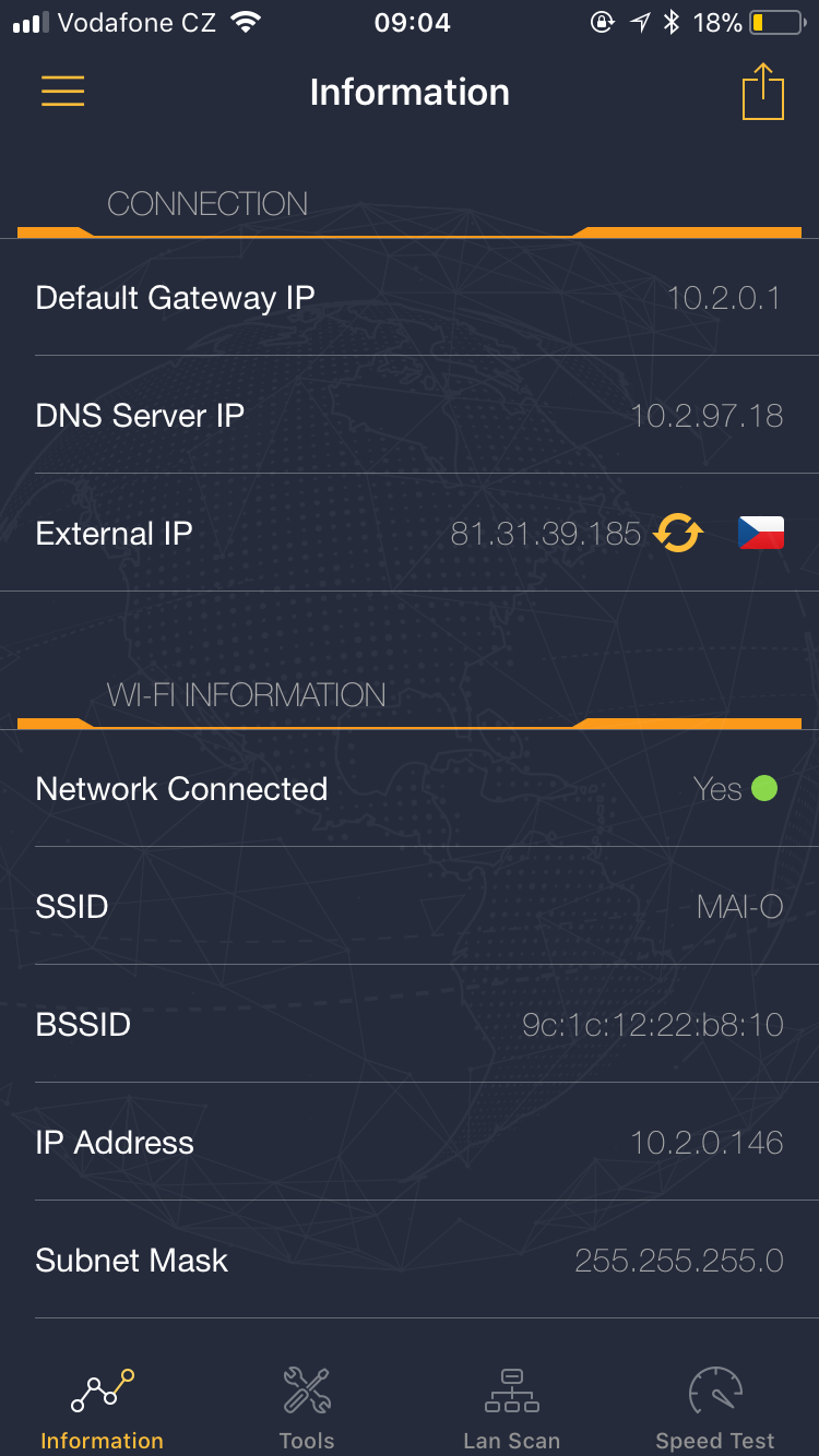 All info in one place, that’s Master Network Analyzer. Discover Wi-Fi information (SSID, BSSID, IP address, subnet mask, and vendor) and Cell Information (your provider and country, IP address, MCC and MNC, and VoIP support).